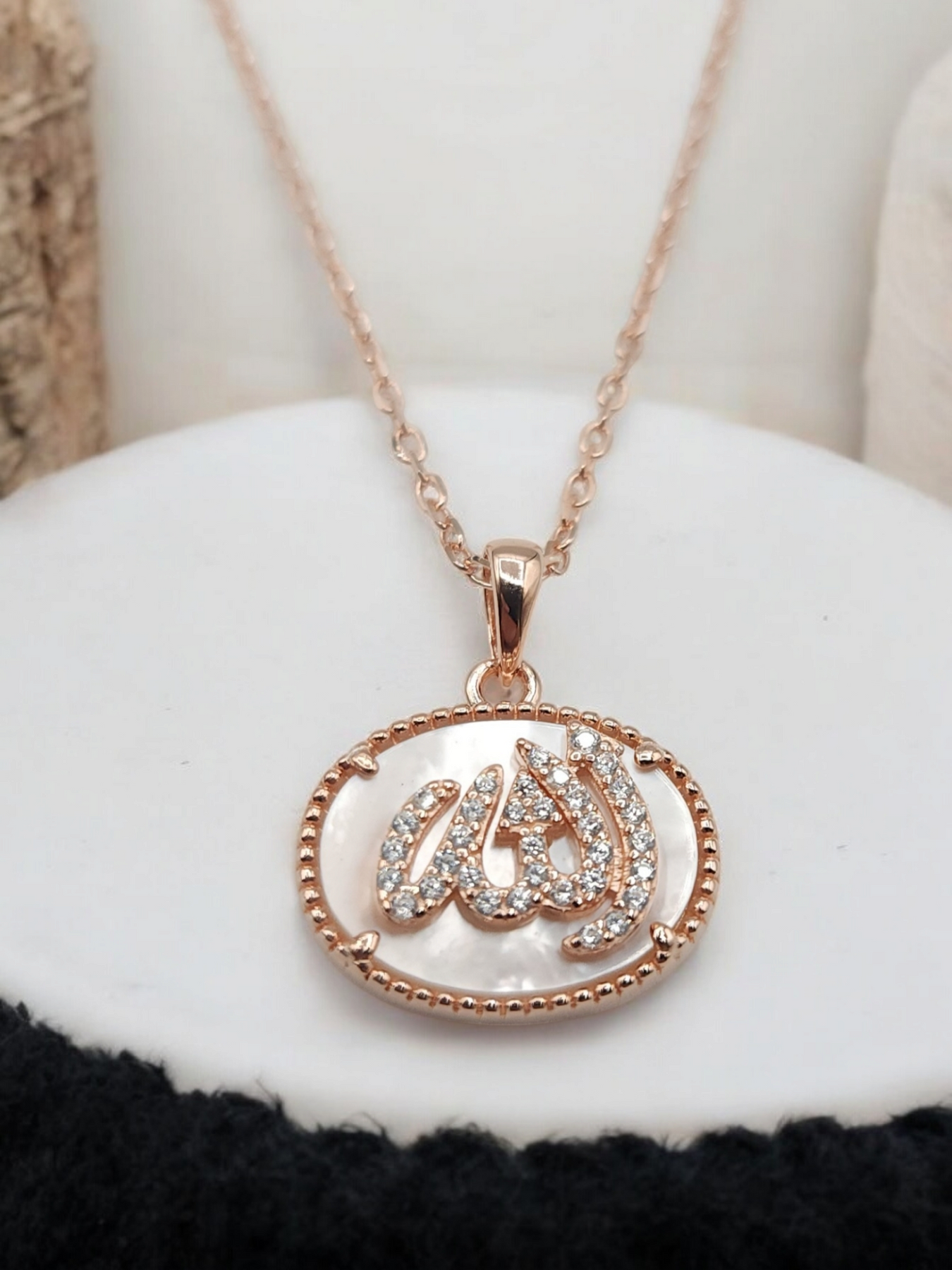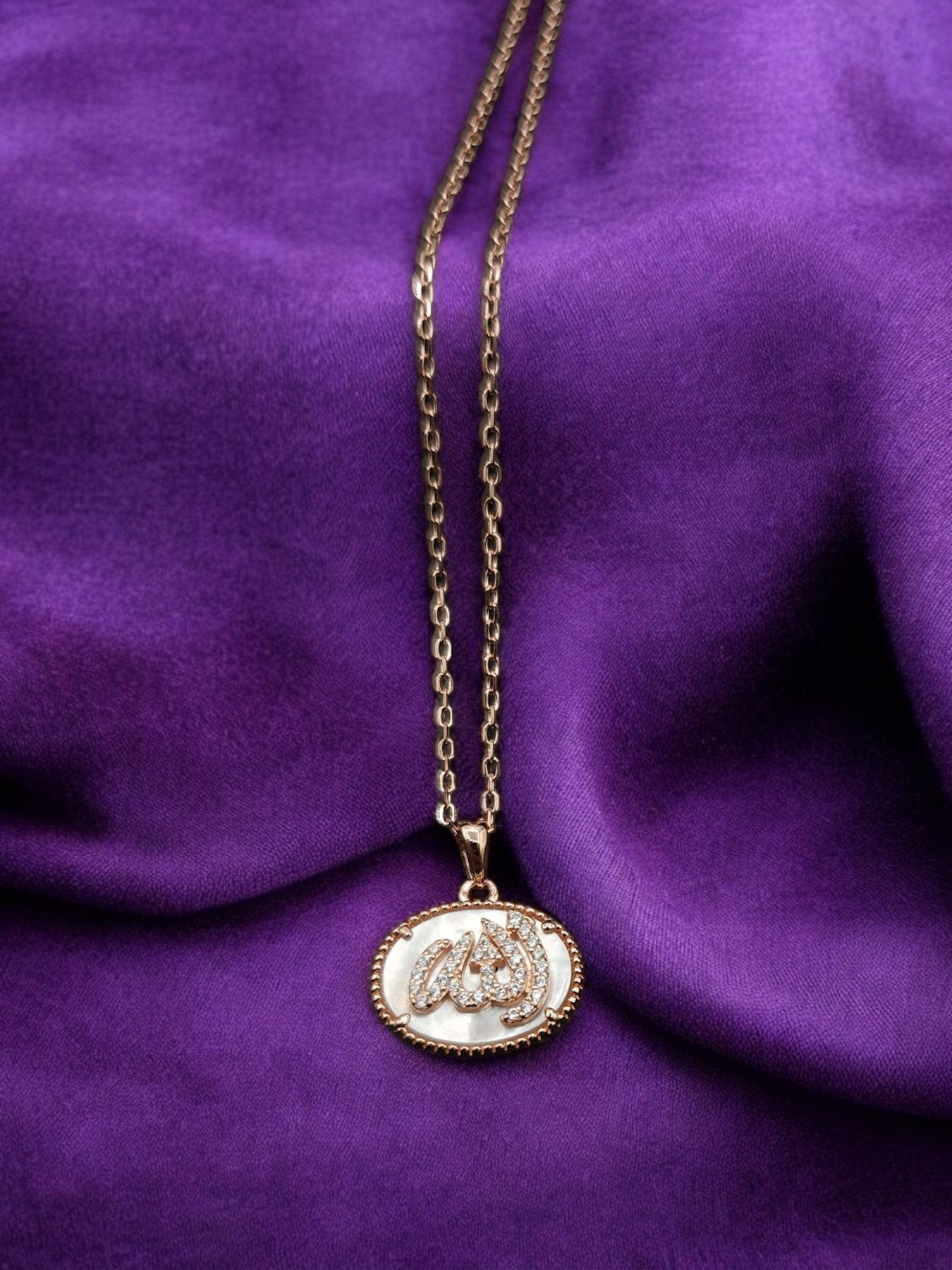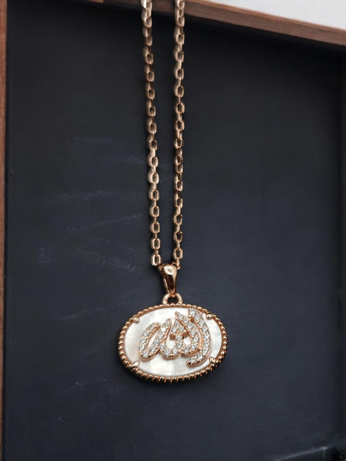 Collier en argent 925 rhodié en or rose avec pendentif portant la mention Allah, en arabe
