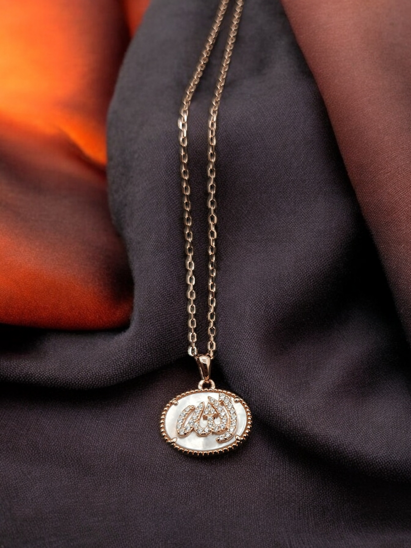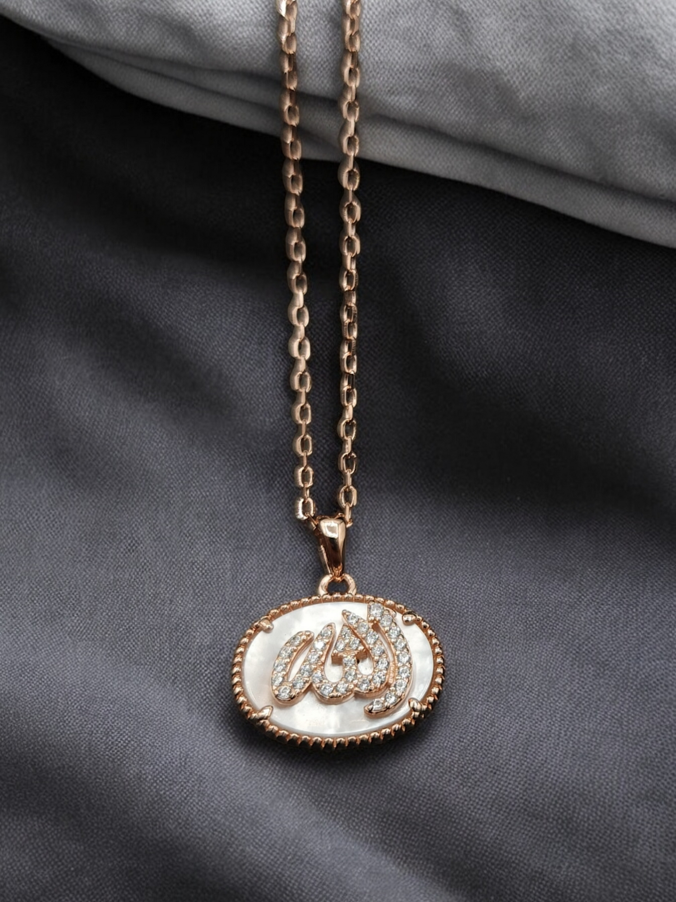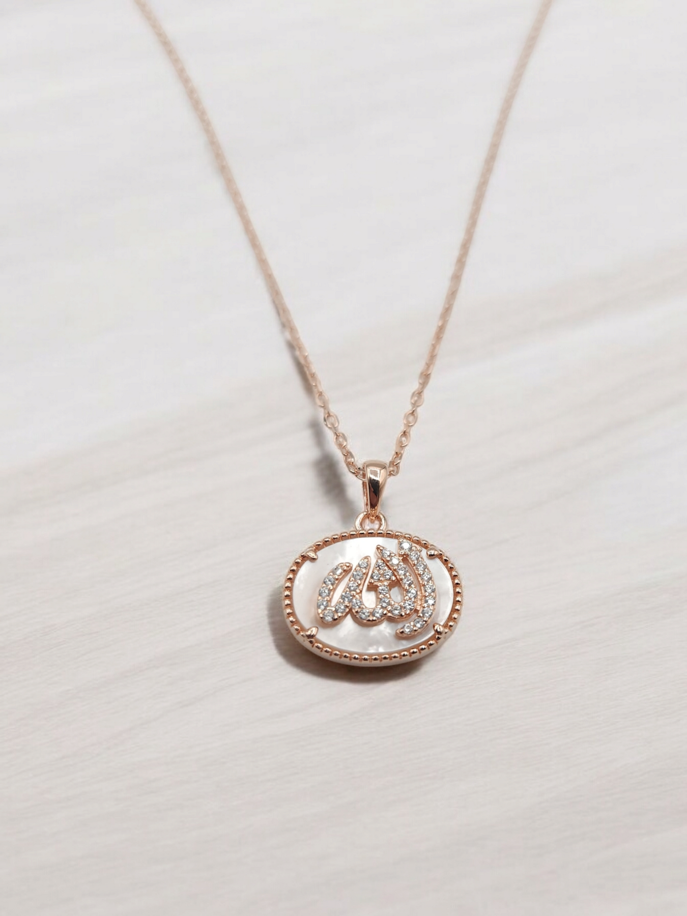 Collier en argent 925 rhodié en or rose avec pendentif portant la mention Allah, en arabe